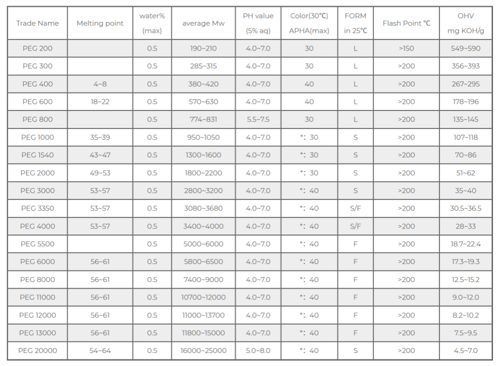 I-PEG-1000 ukuya kwi-PEG-4000: Ubunzima bemolekyuli obuphakathi, i-waxy solids. Njengoko ubunzima bemolekyuli bukhula, kunjalo ke i-viscosity kunye nenqanaba lokunyibilika. Umzekelo, i-PEG-3350 sisisiseko esisetyenziswa ngokuqhelekileyo kwi-suppository kunye ne-ointment kwi-pharmaceuticals, ebonelela ngokubumba kakuhle kunye nokusebenza kokukhutshwa kweziyobisi.